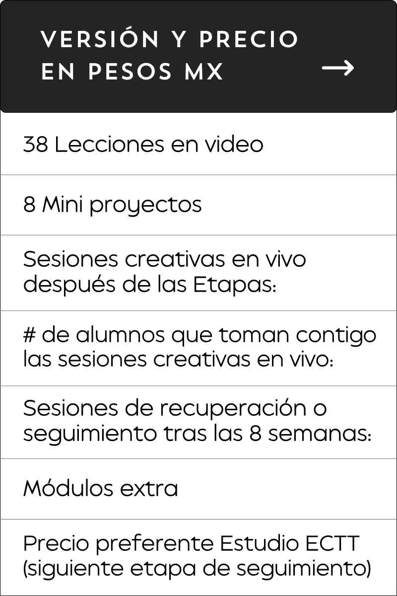 Cada Etapa contiene de 4 a 5 lecciones en video que vas a ver durante la semana, en el horario que mejor te convenga, y a tu ritmo.